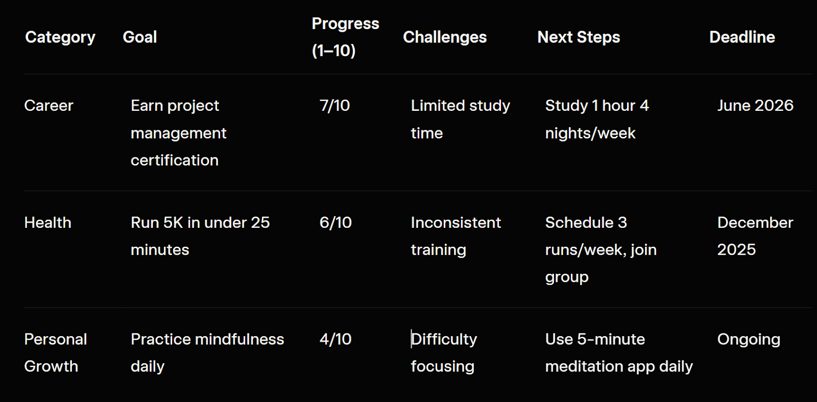 - Draw a table with columns: Goal, Progress (1–10 scale), Challenges, Next Steps, Deadline.